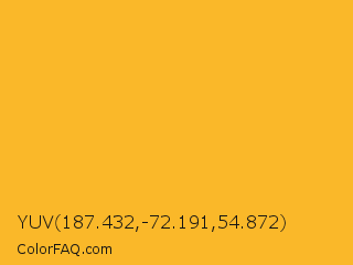 YUV 187.432,-72.191,54.872 Color is a normal orange color and the nearest color is My Sin #ffb31f. Hex code #fab829 and RGB value is rgb(250,184,41). In RGB color space, this color is composed of 98% red, 72% green, 16% blue, In CMYK color space, this color is composed of 0% cyan, 26% magenta, 84% yellow , 2% black , In HSL color space, this color has a hue angle of 41° , 95% saturation and 57% lightness.