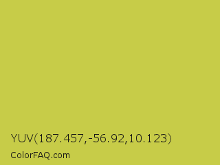 YUV 187.457,-56.92,10.123 Color is a normal yellow color and the nearest color is Turmeric #cabb48. Hex code #c7cc48 and RGB value is rgb(199,204,72). In RGB color space, this color is composed of 78% red, 80% green, 28% blue, In CMYK color space, this color is composed of 2% cyan, 0% magenta, 65% yellow , 20% black , In HSL color space, this color has a hue angle of 62° , 56% saturation and 54% lightness.