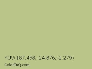 YUV 187.458,-24.876,-1.279 Color is a light lime color and the nearest color is Sage #bcb88a. Hex code #bac689 and RGB value is rgb(186,198,137). In RGB color space, this color is composed of 73% red, 78% green, 54% blue, In CMYK color space, this color is composed of 6% cyan, 0% magenta, 31% yellow , 22% black , In HSL color space, this color has a hue angle of 72° , 35% saturation and 66% lightness.