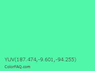 YUV 187.474,-9.601,-94.255 Color is a light green color and the nearest color is Eucalyptus #44d7a8. Hex code #50f6a8 and RGB value is rgb(80,246,168). In RGB color space, this color is composed of 31% red, 96% green, 66% blue, In CMYK color space, this color is composed of 67% cyan, 0% magenta, 32% yellow , 4% black , In HSL color space, this color has a hue angle of 152° , 90% saturation and 64% lightness.