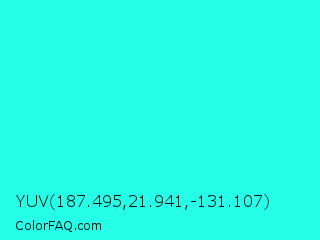 YUV 187.495,21.941,-131.107 Color is a normal cyan color and the nearest color is Loeen #15f2fd. Hex code #26ffe8 and RGB value is rgb(38,255,232). In RGB color space, this color is composed of 15% red, 100% green, 91% blue, In CMYK color space, this color is composed of 85% cyan, 0% magenta, 9% yellow , 0% black , In HSL color space, this color has a hue angle of 174° , 100% saturation and 57% lightness.