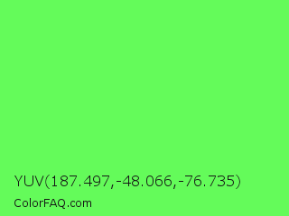 YUV 187.497,-48.066,-76.735 Color is a light green color and the nearest color is Screamin Green #66ff66. Hex code #64fb5a and RGB value is rgb(100,251,90). In RGB color space, this color is composed of 39% red, 98% green, 35% blue, In CMYK color space, this color is composed of 60% cyan, 0% magenta, 64% yellow , 2% black , In HSL color space, this color has a hue angle of 116° , 95% saturation and 67% lightness.