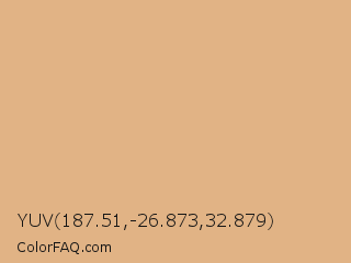 YUV 187.51,-26.873,32.879 Color is a light orange color and the nearest color is Burlywood #deb887. Hex code #e1b385 and RGB value is rgb(225,179,133). In RGB color space, this color is composed of 88% red, 70% green, 52% blue, In CMYK color space, this color is composed of 0% cyan, 20% magenta, 41% yellow , 12% black , In HSL color space, this color has a hue angle of 30° , 61% saturation and 70% lightness.
