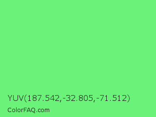 YUV 187.542,-32.805,-71.512 Color is a light green color and the nearest color is Very Light Malachite Green #64e986. Hex code #6af279 and RGB value is rgb(106,242,121). In RGB color space, this color is composed of 42% red, 95% green, 47% blue, In CMYK color space, this color is composed of 56% cyan, 0% magenta, 50% yellow , 5% black , In HSL color space, this color has a hue angle of 127° , 84% saturation and 68% lightness.