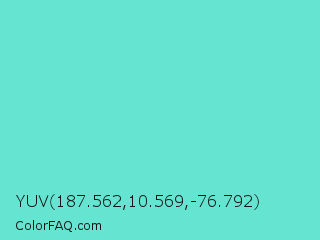 YUV 187.562,10.569,-76.792 Color is a light cyan color and the nearest color is Aquamarine Blue #71d9e2. Hex code #64e4d1 and RGB value is rgb(100,228,209). In RGB color space, this color is composed of 39% red, 89% green, 82% blue, In CMYK color space, this color is composed of 56% cyan, 0% magenta, 8% yellow , 11% black , In HSL color space, this color has a hue angle of 171° , 70% saturation and 64% lightness.