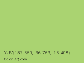 YUV 187.569,-36.763,-15.408 Color is a light green color and the nearest color is Wild Willow #b9c46a. Hex code #aad371 and RGB value is rgb(170,211,113). In RGB color space, this color is composed of 67% red, 83% green, 44% blue, In CMYK color space, this color is composed of 19% cyan, 0% magenta, 46% yellow , 17% black , In HSL color space, this color has a hue angle of 85° , 53% saturation and 64% lightness.