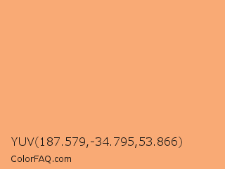 YUV 187.579,-34.795,53.866 Color is a light orange color and the nearest color is Very Light Tangelo #ffb077. Hex code #f9aa75 and RGB value is rgb(249,170,117). In RGB color space, this color is composed of 98% red, 67% green, 46% blue, In CMYK color space, this color is composed of 0% cyan, 32% magenta, 53% yellow , 2% black , In HSL color space, this color has a hue angle of 24° , 92% saturation and 72% lightness.