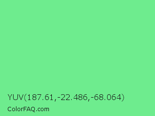 YUV 187.61,-22.486,-68.064 Color is a light green color and the nearest color is Very Light Malachite Green #64e986. Hex code #6eec8e and RGB value is rgb(110,236,142). In RGB color space, this color is composed of 43% red, 93% green, 56% blue, In CMYK color space, this color is composed of 53% cyan, 0% magenta, 40% yellow , 7% black , In HSL color space, this color has a hue angle of 135° , 77% saturation and 68% lightness.