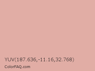 YUV 187.636,-11.16,32.768 Color is a light red color and the nearest color is Pastel Pink #dea5a4. Hex code #e1ada5 and RGB value is rgb(225,173,165). In RGB color space, this color is composed of 88% red, 68% green, 65% blue, In CMYK color space, this color is composed of 0% cyan, 23% magenta, 27% yellow , 12% black , In HSL color space, this color has a hue angle of 8° , 50% saturation and 76% lightness.
