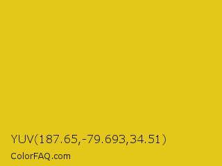 YUV 187.65,-79.693,34.51 Color is a normal yellow color and the nearest color is Sunflower #e4d422. Hex code #e3c71a and RGB value is rgb(227,199,26). In RGB color space, this color is composed of 89% red, 78% green, 10% blue, In CMYK color space, this color is composed of 0% cyan, 12% magenta, 89% yellow , 11% black , In HSL color space, this color has a hue angle of 52° , 79% saturation and 50% lightness.