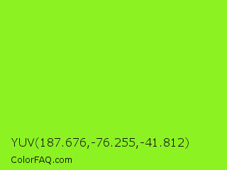 YUV 187.676,-76.255,-41.812 Color is a normal green color and the nearest color is Spring Frost #87ff2a. Hex code #8cf221 and RGB value is rgb(140,242,33). In RGB color space, this color is composed of 55% red, 95% green, 13% blue, In CMYK color space, this color is composed of 42% cyan, 0% magenta, 86% yellow , 5% black , In HSL color space, this color has a hue angle of 89° , 89% saturation and 54% lightness.