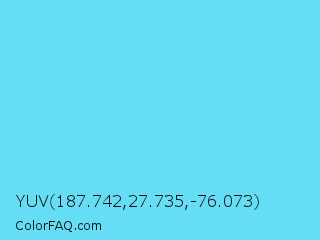 YUV 187.742,27.735,-76.073 Color is a light cyan color and the nearest color is Turquoise Blue #6cdae7. Hex code #65ddf4 and RGB value is rgb(101,221,244). In RGB color space, this color is composed of 40% red, 87% green, 96% blue, In CMYK color space, this color is composed of 59% cyan, 9% magenta, 0% yellow , 4% black , In HSL color space, this color has a hue angle of 190° , 87% saturation and 68% lightness.