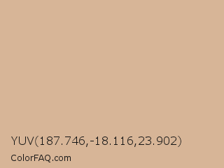 YUV 187.746,-18.116,23.902 Color is a light orange color and the nearest color is Cameo #d9b99b. Hex code #d7b597 and RGB value is rgb(215,181,151). In RGB color space, this color is composed of 84% red, 71% green, 59% blue, In CMYK color space, this color is composed of 0% cyan, 16% magenta, 30% yellow , 16% black , In HSL color space, this color has a hue angle of 28° , 44% saturation and 72% lightness.