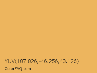 YUV 187.826,-46.256,43.126 Color is a light orange color and the nearest color is Porsche #eaae69. Hex code #edb55e and RGB value is rgb(237,181,94). In RGB color space, this color is composed of 93% red, 71% green, 37% blue, In CMYK color space, this color is composed of 0% cyan, 24% magenta, 60% yellow , 7% black , In HSL color space, this color has a hue angle of 37° , 80% saturation and 65% lightness.
