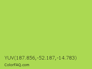 YUV 187.856,-52.187,-14.783 Color is a normal green color and the nearest color is Conifer #acdd4d. Hex code #abd952 and RGB value is rgb(171,217,82). In RGB color space, this color is composed of 67% red, 85% green, 32% blue, In CMYK color space, this color is composed of 21% cyan, 0% magenta, 62% yellow , 15% black , In HSL color space, this color has a hue angle of 80° , 64% saturation and 59% lightness.