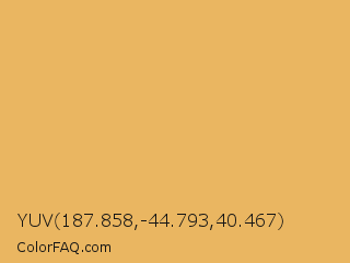 YUV 187.858,-44.793,40.467 Color is a light orange color and the nearest color is Equator #e1bc64. Hex code #eab661 and RGB value is rgb(234,182,97). In RGB color space, this color is composed of 92% red, 71% green, 38% blue, In CMYK color space, this color is composed of 0% cyan, 22% magenta, 59% yellow , 8% black , In HSL color space, this color has a hue angle of 37° , 77% saturation and 65% lightness.