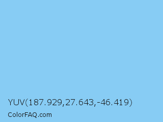 YUV 187.929,27.643,-46.419 Color is a light blue color and the nearest color is Baby Blue #89cff0. Hex code #87ccf4 and RGB value is rgb(135,204,244). In RGB color space, this color is composed of 53% red, 80% green, 96% blue, In CMYK color space, this color is composed of 45% cyan, 16% magenta, 0% yellow , 4% black , In HSL color space, this color has a hue angle of 202° , 83% saturation and 74% lightness.