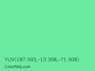 YUV 187.993,-13.308,-71.908 Color is a light green color and the nearest color is Medium Aquamarine #66ddaa. Hex code #6aeba1 and RGB value is rgb(106,235,161). In RGB color space, this color is composed of 42% red, 92% green, 63% blue, In CMYK color space, this color is composed of 55% cyan, 0% magenta, 31% yellow , 8% black , In HSL color space, this color has a hue angle of 146° , 76% saturation and 67% lightness.