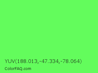 YUV 188.013,-47.334,-78.064 Color is a light green color and the nearest color is Screamin Green #66ff66. Hex code #63fc5c and RGB value is rgb(99,252,92). In RGB color space, this color is composed of 39% red, 99% green, 36% blue, In CMYK color space, this color is composed of 61% cyan, 0% magenta, 63% yellow , 1% black , In HSL color space, this color has a hue angle of 117° , 96% saturation and 67% lightness.