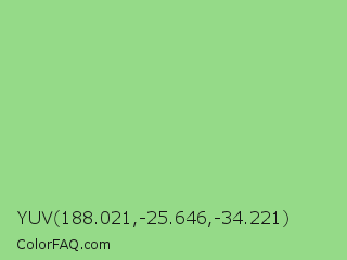 YUV 188.021,-25.646,-34.221 Color is a light green color and the nearest color is Feijoa #9fdd8c. Hex code #95da88 and RGB value is rgb(149,218,136). In RGB color space, this color is composed of 58% red, 85% green, 53% blue, In CMYK color space, this color is composed of 32% cyan, 0% magenta, 38% yellow , 15% black , In HSL color space, this color has a hue angle of 110° , 53% saturation and 69% lightness.