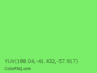 YUV 188.04,-41.432,-57.917 Color is a light green color and the nearest color is Pastel Green #77dd77. Hex code #7aee68 and RGB value is rgb(122,238,104). In RGB color space, this color is composed of 48% red, 93% green, 41% blue, In CMYK color space, this color is composed of 49% cyan, 0% magenta, 56% yellow , 7% black , In HSL color space, this color has a hue angle of 112° , 80% saturation and 67% lightness.