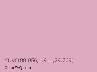 YUV 188.056,1.944,29.769 Color is a light rose color and the nearest color is Blossom #dcb4bc. Hex code #deaac0 and RGB value is rgb(222,170,192). In RGB color space, this color is composed of 87% red, 67% green, 75% blue, In CMYK color space, this color is composed of 0% cyan, 23% magenta, 14% yellow , 13% black , In HSL color space, this color has a hue angle of 335° , 44% saturation and 77% lightness.