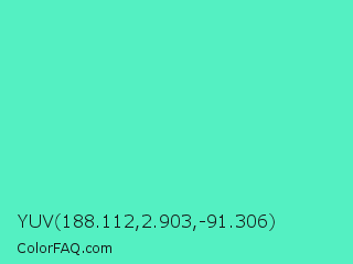 YUV 188.112,2.903,-91.306 Color is a light green color and the nearest color is Turquoise #40e0d0. Hex code #54f0c2 and RGB value is rgb(84,240,194). In RGB color space, this color is composed of 33% red, 94% green, 76% blue, In CMYK color space, this color is composed of 65% cyan, 0% magenta, 19% yellow , 6% black , In HSL color space, this color has a hue angle of 162° , 84% saturation and 64% lightness.