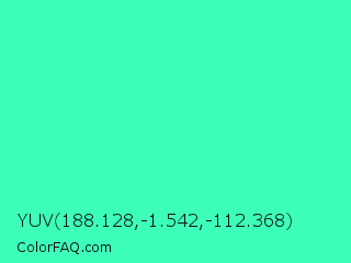 YUV 188.128,-1.542,-112.368 Color is a light green color and the nearest color is Turquoise #40e0d0. Hex code #3cfeb9 and RGB value is rgb(60,254,185). In RGB color space, this color is composed of 24% red, 100% green, 73% blue, In CMYK color space, this color is composed of 76% cyan, 0% magenta, 27% yellow , 0% black , In HSL color space, this color has a hue angle of 159° , 99% saturation and 62% lightness.