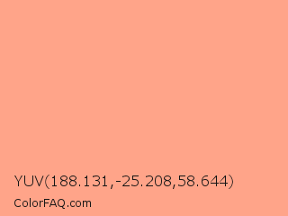 YUV 188.131,-25.208,58.644 Color is a light red color and the nearest color is Vivid Tangerine #ffa089. Hex code #ffa489 and RGB value is rgb(255,164,137). In RGB color space, this color is composed of 100% red, 64% green, 54% blue, In CMYK color space, this color is composed of 0% cyan, 36% magenta, 46% yellow , 0% black , In HSL color space, this color has a hue angle of 14° , 100% saturation and 77% lightness.