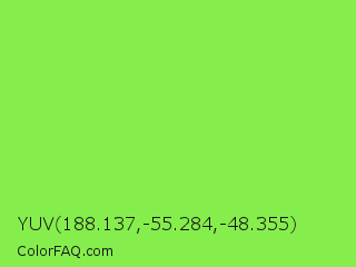 YUV 188.137,-55.284,-48.355 Color is a light green color and the nearest color is Kiwi #8ee53f. Hex code #85ee4c and RGB value is rgb(133,238,76). In RGB color space, this color is composed of 52% red, 93% green, 30% blue, In CMYK color space, this color is composed of 44% cyan, 0% magenta, 68% yellow , 7% black , In HSL color space, this color has a hue angle of 99° , 83% saturation and 62% lightness.