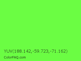 YUV 188.142,-59.723,-71.162 Color is a light green color and the nearest color is Screamin Green #66ff66. Hex code #6bfd43 and RGB value is rgb(107,253,67). In RGB color space, this color is composed of 42% red, 99% green, 26% blue, In CMYK color space, this color is composed of 58% cyan, 0% magenta, 74% yellow , 1% black , In HSL color space, this color has a hue angle of 107° , 98% saturation and 63% lightness.