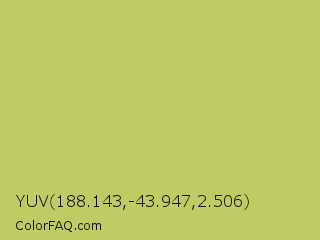 YUV 188.143,-43.947,2.506 Color is a normal yellow color and the nearest color is Wild Willow #b9c46a. Hex code #bfcc63 and RGB value is rgb(191,204,99). In RGB color space, this color is composed of 75% red, 80% green, 39% blue, In CMYK color space, this color is composed of 6% cyan, 0% magenta, 51% yellow , 20% black , In HSL color space, this color has a hue angle of 67° , 51% saturation and 59% lightness.