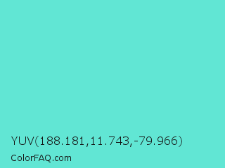 YUV 188.181,11.743,-79.966 Color is a light cyan color and the nearest color is Aquamarine Blue #71d9e2. Hex code #61e6d4 and RGB value is rgb(97,230,212). In RGB color space, this color is composed of 38% red, 90% green, 83% blue, In CMYK color space, this color is composed of 58% cyan, 0% magenta, 8% yellow , 10% black , In HSL color space, this color has a hue angle of 172° , 73% saturation and 64% lightness.