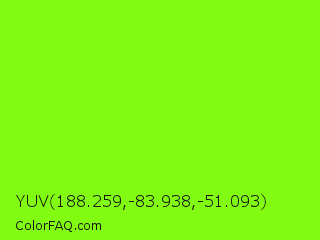 YUV 188.259,-83.938,-51.093 Color is a normal green color and the nearest color is Chartreuse #7fff00. Hex code #82fb12 and RGB value is rgb(130,251,18). In RGB color space, this color is composed of 51% red, 98% green, 7% blue, In CMYK color space, this color is composed of 48% cyan, 0% magenta, 93% yellow , 2% black , In HSL color space, this color has a hue angle of 91° , 97% saturation and 53% lightness.