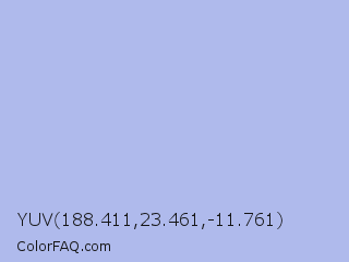 YUV 188.411,23.461,-11.761 Color is a very light blue color and the nearest color is Perano #a9bef2. Hex code #afbaec and RGB value is rgb(175,186,236). In RGB color space, this color is composed of 69% red, 73% green, 93% blue, In CMYK color space, this color is composed of 26% cyan, 21% magenta, 0% yellow , 7% black , In HSL color space, this color has a hue angle of 229° , 62% saturation and 81% lightness.