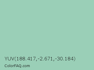 YUV 188.417,-2.671,-30.184 Color is a light green color and the nearest color is Turquoise Green #a0d6b4. Hex code #9acfb7 and RGB value is rgb(154,207,183). In RGB color space, this color is composed of 60% red, 81% green, 72% blue, In CMYK color space, this color is composed of 26% cyan, 0% magenta, 12% yellow , 19% black , In HSL color space, this color has a hue angle of 153° , 36% saturation and 71% lightness.
