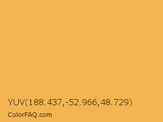 YUV 188.437,-52.966,48.729 Color is a light orange color and the nearest color is Casablanca #f8b853. Hex code #f4b551 and RGB value is rgb(244,181,81). In RGB color space, this color is composed of 96% red, 71% green, 32% blue, In CMYK color space, this color is composed of 0% cyan, 26% magenta, 67% yellow , 4% black , In HSL color space, this color has a hue angle of 37° , 88% saturation and 64% lightness.