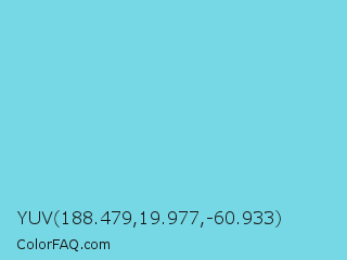 YUV 188.479,19.977,-60.933 Color is a light cyan color and the nearest color is Sky Blue #76d7ea. Hex code #77d8e5 and RGB value is rgb(119,216,229). In RGB color space, this color is composed of 47% red, 85% green, 90% blue, In CMYK color space, this color is composed of 48% cyan, 6% magenta, 0% yellow , 10% black , In HSL color space, this color has a hue angle of 187° , 68% saturation and 68% lightness.