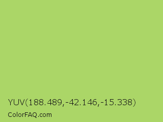 YUV 188.489,-42.146,-15.338 Color is a light green color and the nearest color is Wild Willow #b9c46a. Hex code #abd667 and RGB value is rgb(171,214,103). In RGB color space, this color is composed of 67% red, 84% green, 40% blue, In CMYK color space, this color is composed of 20% cyan, 0% magenta, 52% yellow , 16% black , In HSL color space, this color has a hue angle of 83° , 58% saturation and 62% lightness.