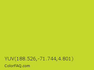 YUV 188.526,-71.744,4.801 Color is a normal yellow color and the nearest color is Key Lime Pie #bfc921. Hex code #c2d62b and RGB value is rgb(194,214,43). In RGB color space, this color is composed of 76% red, 84% green, 17% blue, In CMYK color space, this color is composed of 9% cyan, 0% magenta, 80% yellow , 16% black , In HSL color space, this color has a hue angle of 67° , 68% saturation and 50% lightness.