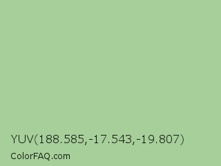 YUV 188.585,-17.543,-19.807 Color is a light green color and the nearest color is Norway #a8bd9f. Hex code #a6cf99 and RGB value is rgb(166,207,153). In RGB color space, this color is composed of 65% red, 81% green, 60% blue, In CMYK color space, this color is composed of 20% cyan, 0% magenta, 26% yellow , 19% black , In HSL color space, this color has a hue angle of 106° , 36% saturation and 71% lightness.