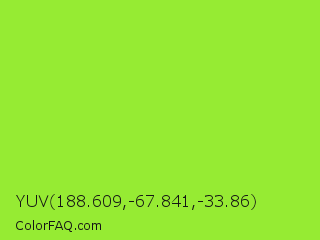 YUV 188.609,-67.841,-33.86 Color is a normal green color and the nearest color is Kiwi #8ee53f. Hex code #96eb33 and RGB value is rgb(150,235,51). In RGB color space, this color is composed of 59% red, 92% green, 20% blue, In CMYK color space, this color is composed of 36% cyan, 0% magenta, 78% yellow , 8% black , In HSL color space, this color has a hue angle of 88° , 82% saturation and 56% lightness.