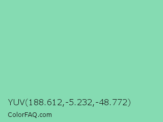 YUV 188.612,-5.232,-48.772 Color is a light green color and the nearest color is Vista Blue #8fd6b4. Hex code #85dbb2 and RGB value is rgb(133,219,178). In RGB color space, this color is composed of 52% red, 86% green, 70% blue, In CMYK color space, this color is composed of 39% cyan, 0% magenta, 19% yellow , 14% black , In HSL color space, this color has a hue angle of 151° , 54% saturation and 69% lightness.