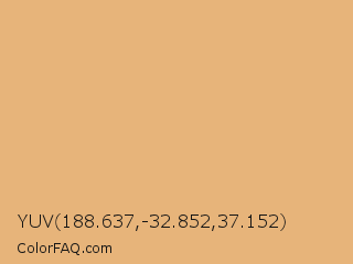 YUV 188.637,-32.852,37.152 Color is a light orange color and the nearest color is Middle Yellow Red #ecb176. Hex code #e7b47a and RGB value is rgb(231,180,122). In RGB color space, this color is composed of 91% red, 71% green, 48% blue, In CMYK color space, this color is composed of 0% cyan, 22% magenta, 47% yellow , 9% black , In HSL color space, this color has a hue angle of 32° , 69% saturation and 69% lightness.