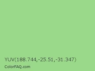 YUV 188.744,-25.51,-31.347 Color is a light green color and the nearest color is Feijoa #9fdd8c. Hex code #99d989 and RGB value is rgb(153,217,137). In RGB color space, this color is composed of 60% red, 85% green, 54% blue, In CMYK color space, this color is composed of 29% cyan, 0% magenta, 37% yellow , 15% black , In HSL color space, this color has a hue angle of 108° , 51% saturation and 69% lightness.
