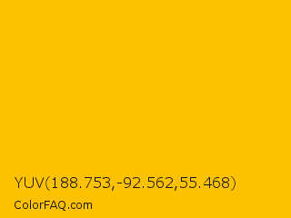 YUV 188.753,-92.562,55.468 Color is a normal yellow color and the nearest color is Golden Poppy #fcc200. Hex code #fcc101 and RGB value is rgb(252,193,1). In RGB color space, this color is composed of 99% red, 76% green, 0% blue, In CMYK color space, this color is composed of 0% cyan, 23% magenta, 100% yellow , 1% black , In HSL color space, this color has a hue angle of 46° , 99% saturation and 50% lightness.