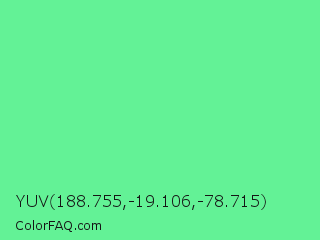 YUV 188.755,-19.106,-78.715 Color is a light green color and the nearest color is Very Light Malachite Green #64e986. Hex code #63f296 and RGB value is rgb(99,242,150). In RGB color space, this color is composed of 39% red, 95% green, 59% blue, In CMYK color space, this color is composed of 59% cyan, 0% magenta, 38% yellow , 5% black , In HSL color space, this color has a hue angle of 141° , 85% saturation and 67% lightness.