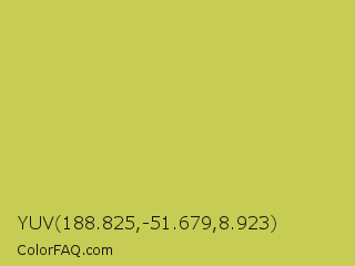 YUV 188.825,-51.679,8.923 Color is a normal yellow color and the nearest color is June Bud #bdda57. Hex code #c7cc54 and RGB value is rgb(199,204,84). In RGB color space, this color is composed of 78% red, 80% green, 33% blue, In CMYK color space, this color is composed of 2% cyan, 0% magenta, 59% yellow , 20% black , In HSL color space, this color has a hue angle of 63° , 54% saturation and 56% lightness.