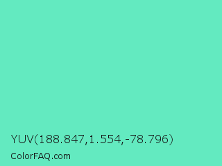 YUV 188.847,1.554,-78.796 Color is a light green color and the nearest color is Medium Aquamarine #66ddaa. Hex code #63eac0 and RGB value is rgb(99,234,192). In RGB color space, this color is composed of 39% red, 92% green, 75% blue, In CMYK color space, this color is composed of 58% cyan, 0% magenta, 18% yellow , 8% black , In HSL color space, this color has a hue angle of 161° , 76% saturation and 65% lightness.