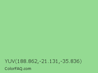 YUV 188.862,-21.131,-35.836 Color is a light green color and the nearest color is Granny Smith Apple Crayola #9de093. Hex code #94da92 and RGB value is rgb(148,218,146). In RGB color space, this color is composed of 58% red, 85% green, 57% blue, In CMYK color space, this color is composed of 32% cyan, 0% magenta, 33% yellow , 15% black , In HSL color space, this color has a hue angle of 118° , 49% saturation and 71% lightness.